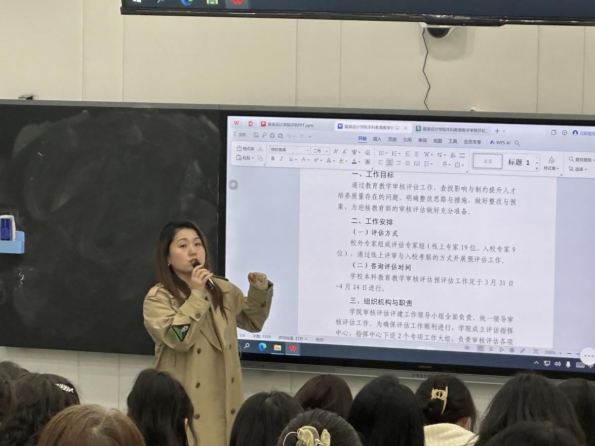 本次启动会以“统一思想、明确责任、强化落实、全员参与”为核心目标,围绕《服装设计学院本科教育教学审核评估工作方案》进行详细解读与工作动员。罗密副院长就评估工作的重要性、紧迫性与实施策略作出全面部署,强调审核评估不仅是对学院教育教学质量的一次系统体检,更是推动学院高质量发展的关键契机(如图1-1)。
